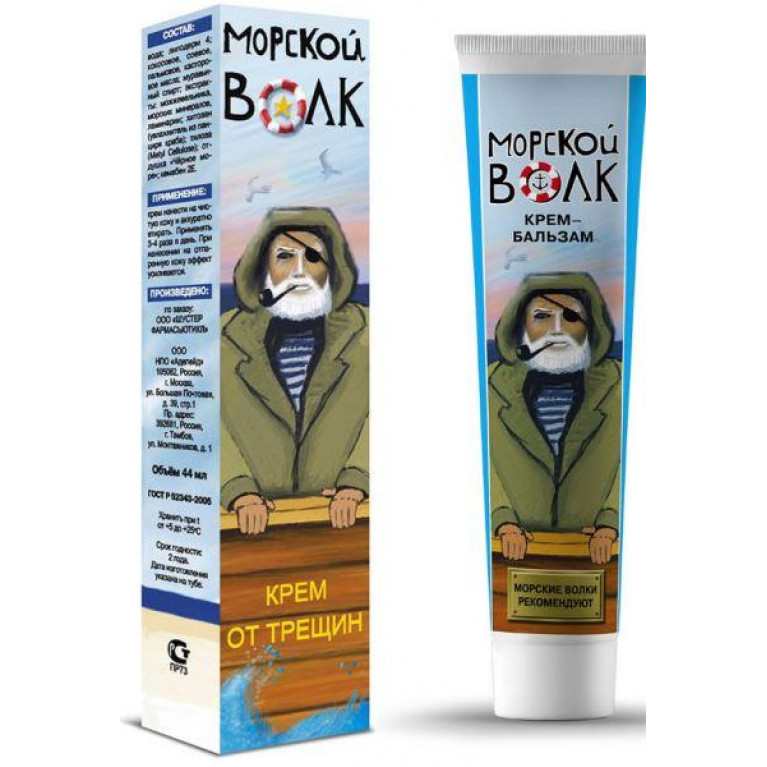 Морской волк крем-бальзам для ухода за пересушенной и потрескавшейся кожей, повреждённой агрессивным воздействием окружающей среды (холод, вода, ветр, жара, солнце), а так же нехваткой питательных веществ, крем-бальзам от трещин, смягчающий. Крем создан из натуральных, экологически чистых компонентов: экстрактов и масел целебных растений, морских водорослей и морских минералов. Благодаря хорошим проникающим свойствам муравьиного спирта, активные вещества, содержащиеся в креме, быстро проникают сквозь кожный покров в поврежденные клетки ткани. Морские минералы мгновенно смягчают огрубевшую и пересушенную кожу, обеспечивают питательными веществами, микроэлементами, способствуют, скорейшему восстановлению и заживлению кожного покрова. Бальзам быстро впитывается, оставляя кожу шелковистой и гладкой. Крем способствует заживлению трещин и ранок на пальцах и ладонях рук, подошвах и пятках ног, обладает антисептическим действием; ускоряет процесс обновления клеток кожи, улучшает ее структуру, придаёт ей упругость и эластичность; великолепно смягчает кожу, устраняет неприятное чувство сухости; на долго защищает кожу от пересыхания; интенсивно питает микроэлементами, минеральными веществами и витаминами; способствует снятию воспалений; при систематическом применении усиливает естественные защитные функции. Крем наносить на чистую кожу и аккуратно втирать. Применять 3-4 раза в день. При нанесении на отпаренную кожу эффект усиливается. Объем тубы 44 мл. Детям до 5 лет не применять! Перед применением рекомендуется проконсультироваться с врачом.