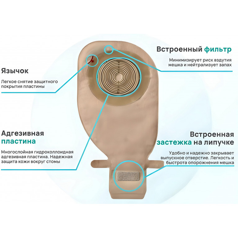 Фильтр не пропускает неприятные запахи, но выпускает воздух не мешка, препятствуя раздуванию калоприемника.
