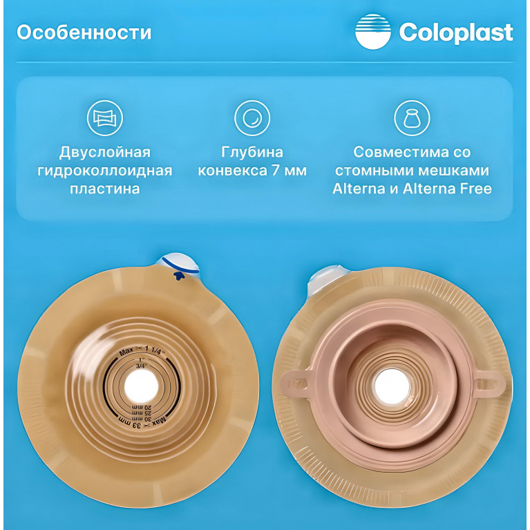 Конвексные пластины Алтерна от компании Колопласт способны на протяжении нескольких суток обеспечить прочное крепление двухкомпонентного калоприемника к передней брюшной стенке.