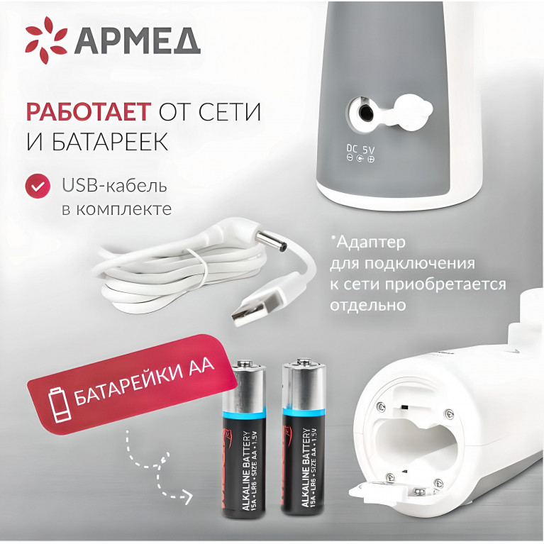 Кроме того, в комплект входят батарейки и USB-кабель для работы от сети.