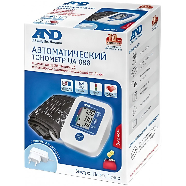 Цифровой автоматический тонометр AND UA-888E, Эконом, со стандартной манжетой AND Cufbox-AU для рук с длиной окружности плеча 22 - 32 см. предназначен для применения в качестве индивидуального средства контроля артериального давления и частоты пульса, а также для динамических наблюдений за изменением параметров в медицинских учреждениях.