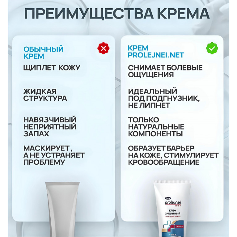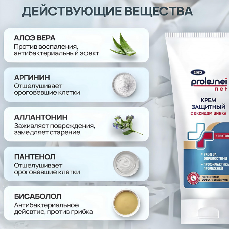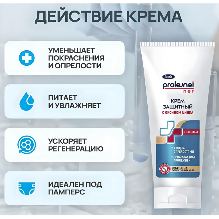 ЭликСи PROLEJNEI NET Крем защитный с оксидом цинка - высокоэффективное средство, которое применяется для ежедневного ухода за кожей лежачих больных и людей с ограниченной подвижностью.