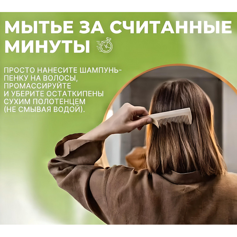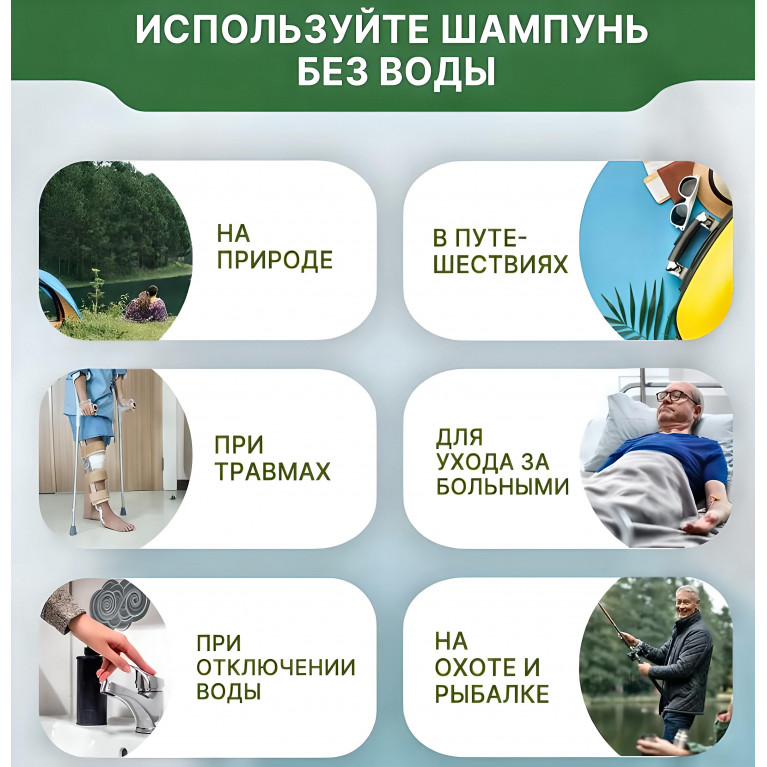 Шампунь для мытья без использования воды идеально подходит для пожилых людей, инвалидов или обездвиженных, у которых затруднено мытье волос в ванне или душе.