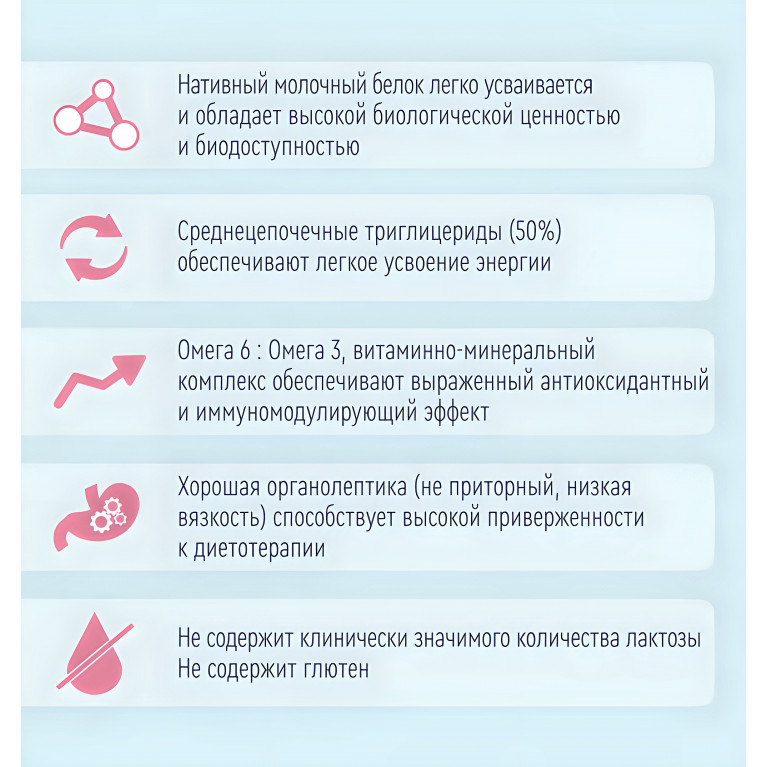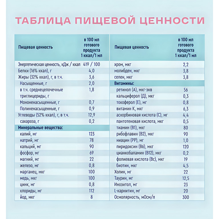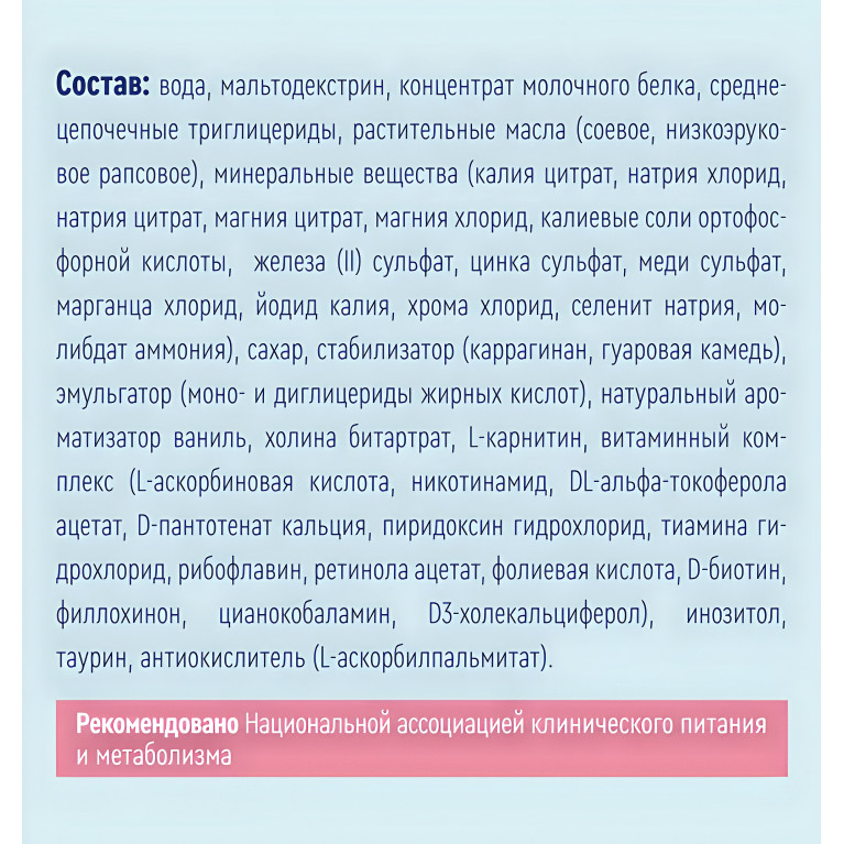 Вода, мальтодекстрин, концентрат молочного белка, среднецепочечные триглицериды, растительные масла (соевое, низкоэруковое рапсовое), минеральные вещества (хлорид магния, фосфат калия, цитрат калия, карбонат кальция, хлорид натрия, фосфат кальция, цитрат натрия, сульфат железа, сульфат цинка, сульфат меди, хлорид марганца, йодид калия, хлорид хрома, селенит натрия, молибдат аммония), сахар, ароматизатор, витамины (аскорбиновая кислота, никотинамид, токоферол ацетат, пантотенат кальция, пиридоксин гидрохлорид, тиамин гидрохлорид, рибофлавин, ретинол ацетат, фолиевая кислота, d-биотин, филлохинон, цианокобаламин, холекальциферол), холин битартрат, инозитол, L-карнитин, таурин, эмульгатор (лецитин), антиокислитель (аскорбилпальмитат).