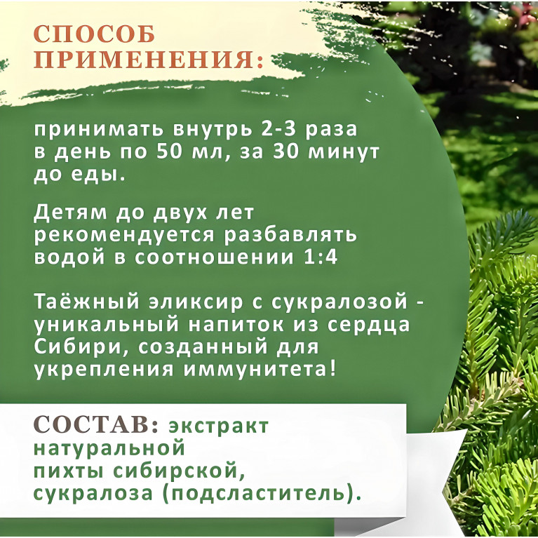 Таёжный эликсир — это комплекс биологически активных веществ, включающий витамины, жизненно важные микроэлементы, фитонциды и флавоноиды.