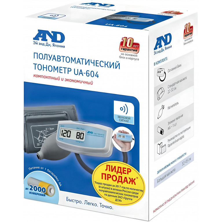 Полуавтоматический тонометр AND UA-604 с манжетой AND UA-Cufbox-AU (22 - 32 см.) является полуавтоматическим цифровым прибором для измерения артериального давления и частоты пульса на плечевой зоне.