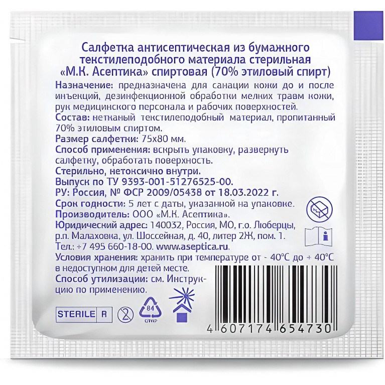 Салфетка спиртовая д/инъекций Асептика 75 х 80 мм - салфетки антисептические спиртовые с 70% раствором этилового спирта высшей очистки.
