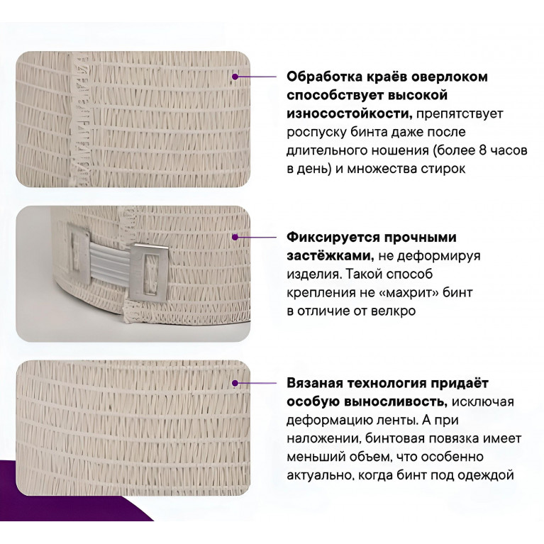 Тканая технология бинта придает ему особую выносливость даже при длительном применении, исключая деформацию ленты.