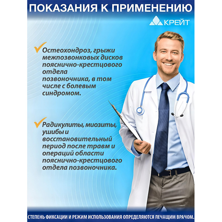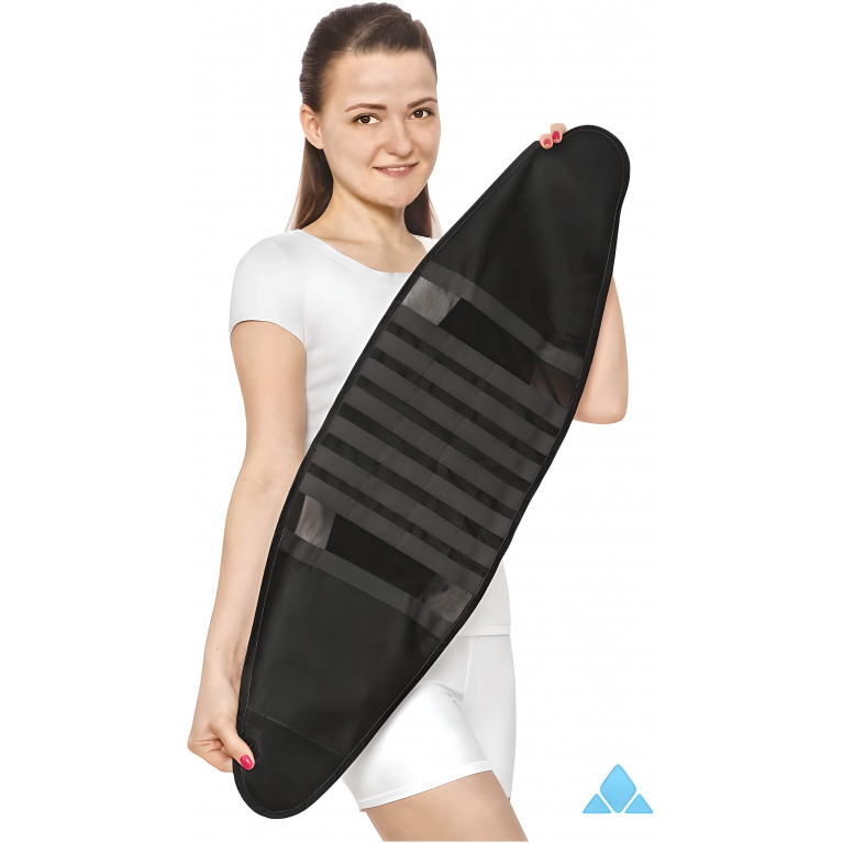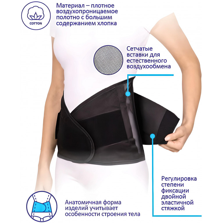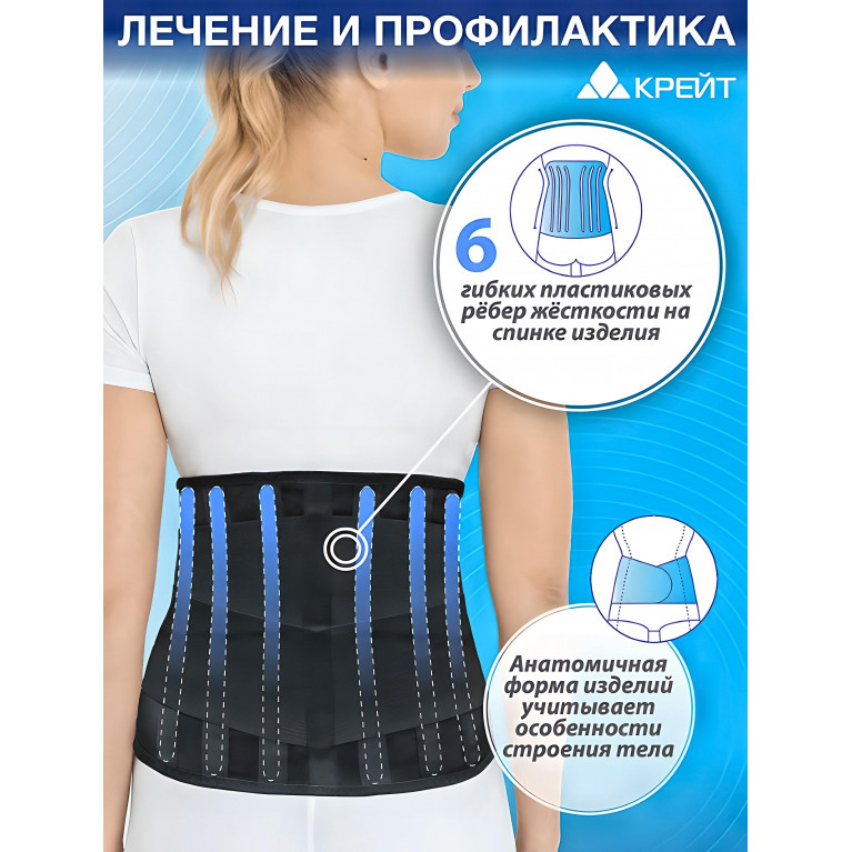 Имеет 6 пластиковых ребер жесткости, ребра обеспечивают плотную фиксацию и стабилизацию позвоночника