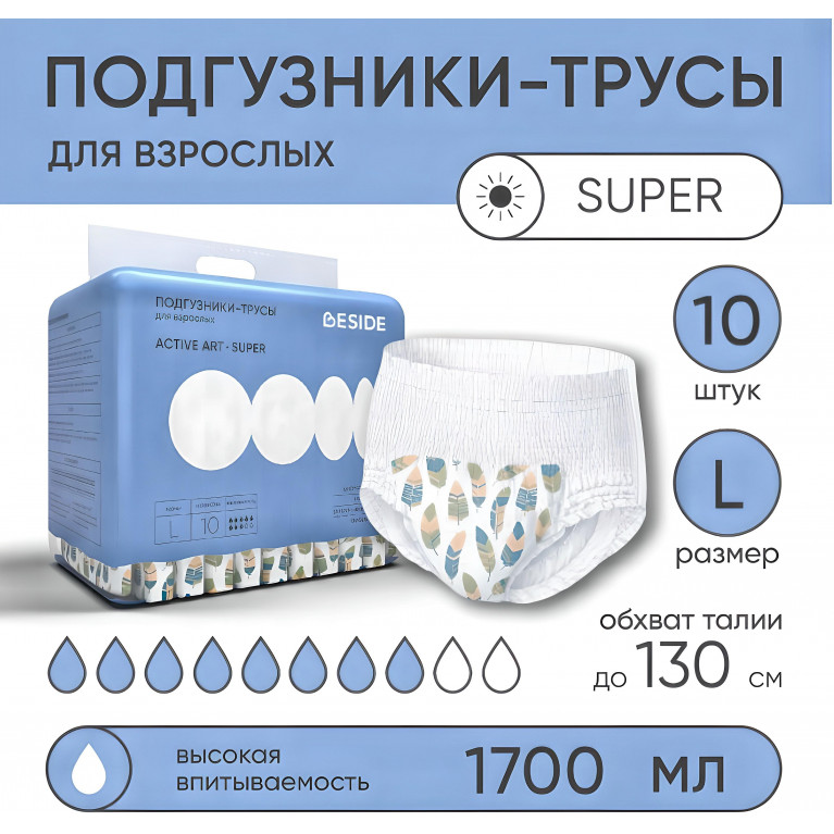 Трусы впитывающие одноразовые для взрослых Beside Active Art Super показаны к использованию для сохранения норм гигиены и