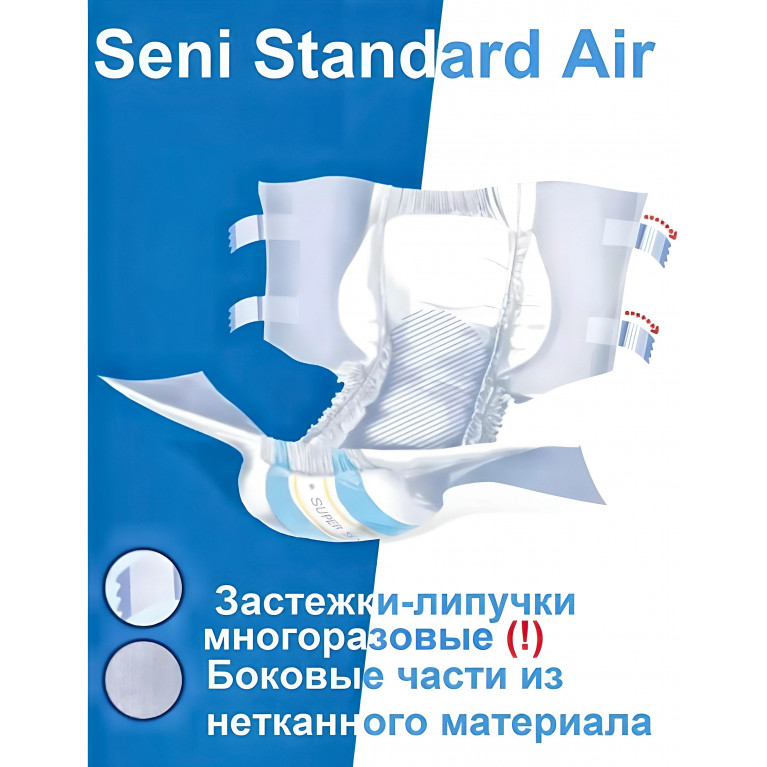 Также отличием является наружный слой подгузника- в Seni Standard это изоляционная пленка. Вид подгузников можно определить по цвету изоляционной пленки- в Seni Standard она голубая.