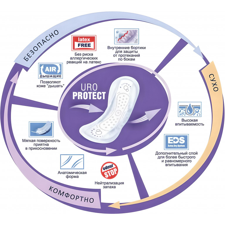 Система свойств прокладки URO PROTECT обеспечивают комфорт, сухость и безопасность при использовании.