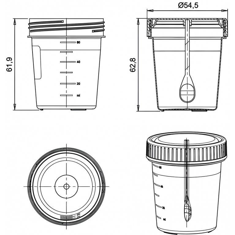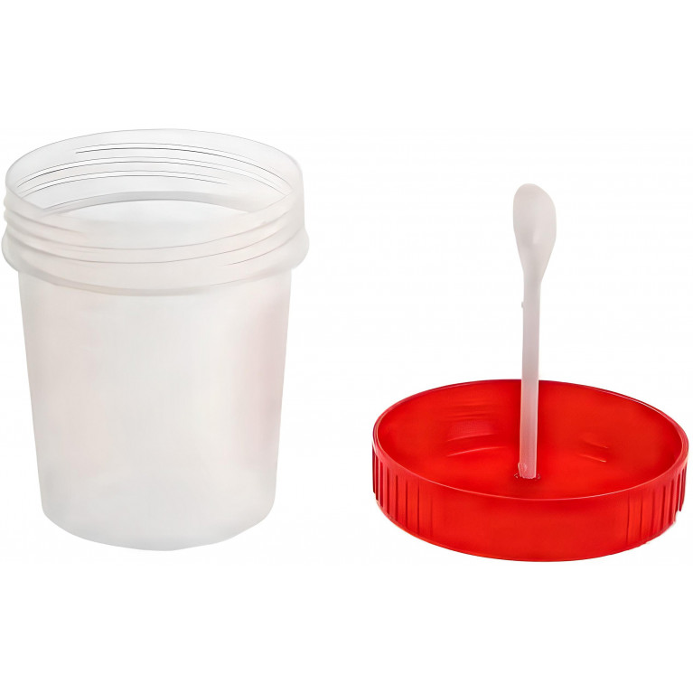 Стерильный контейнер объемом 60 мл с ложкой-шпателем, полем для надписей и градуировкой для взятия образцов биоматериала и транспортировки до места проведения анализов.