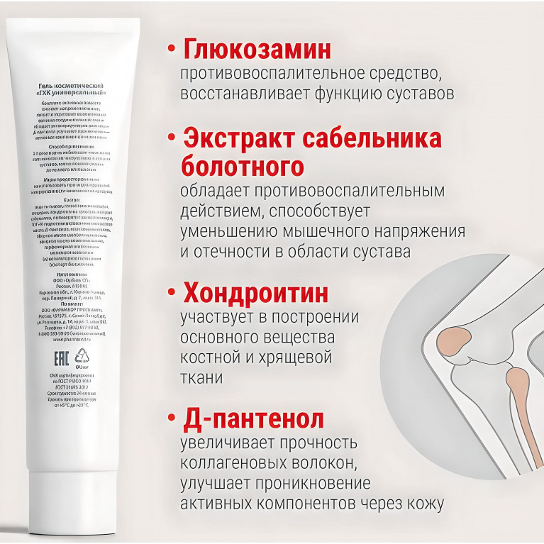 Гель косметический «ГХК универсальный» - изготовлен на основе натуральных компонентов - глюкозамина, хондроитина, экстракта сабельника болотного, эфирных масел можжевельника, мускатного шалфея.
