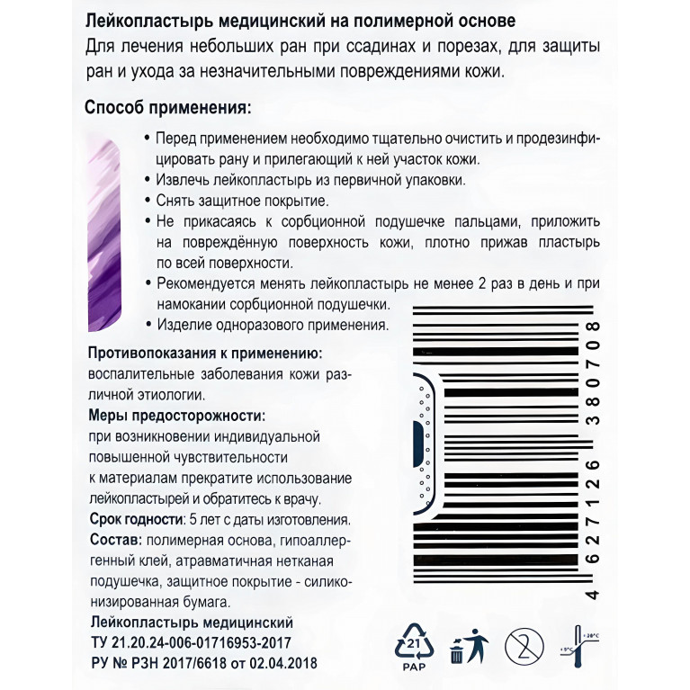 Предназначен для использования в качестве наружного перевязочного средства при механических повреждениях кожи: небольших порезах, ссадинах, царапинах.