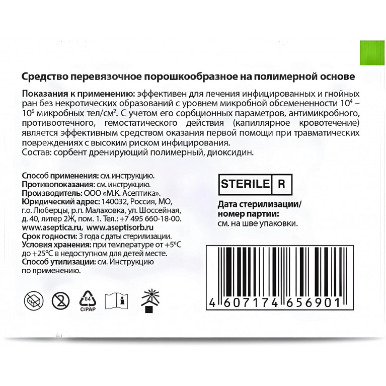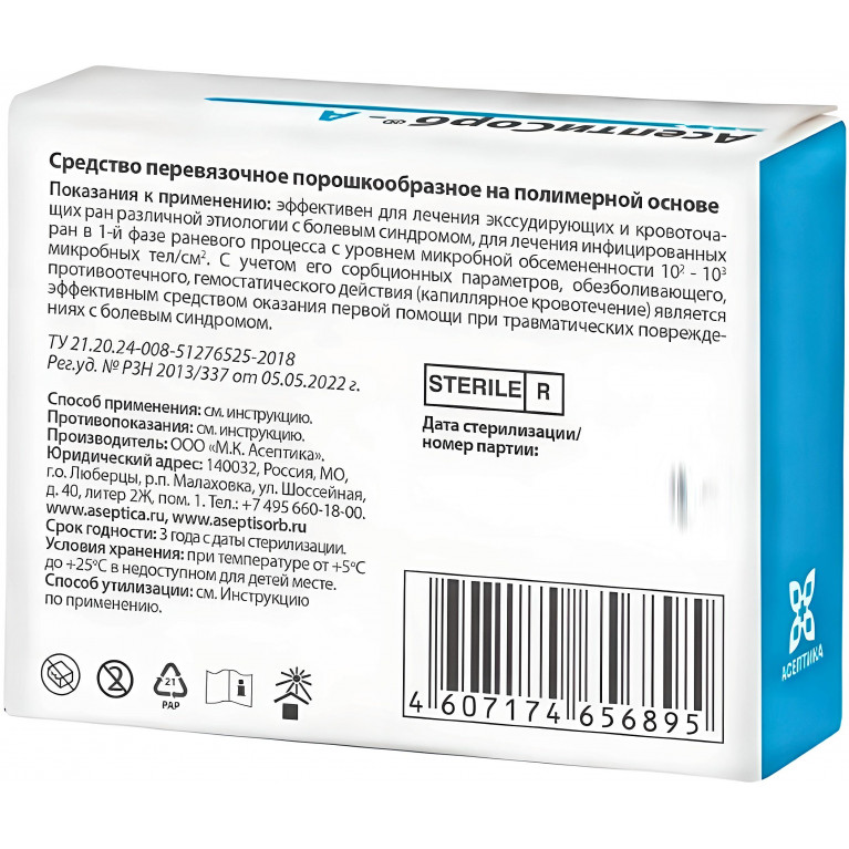 АсептиСорб® - А представляет собой порошкообразное стерильное перевязочное средство одноразового применения.