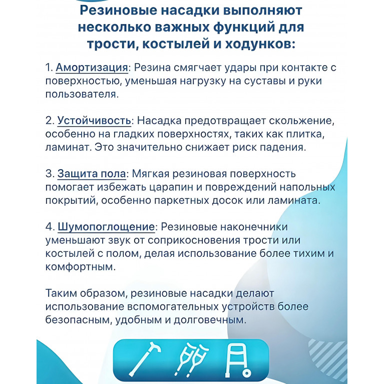 Насадка- наконечник подходит любым тростям, костылям и ходункам с трубами диаметром 19мм.