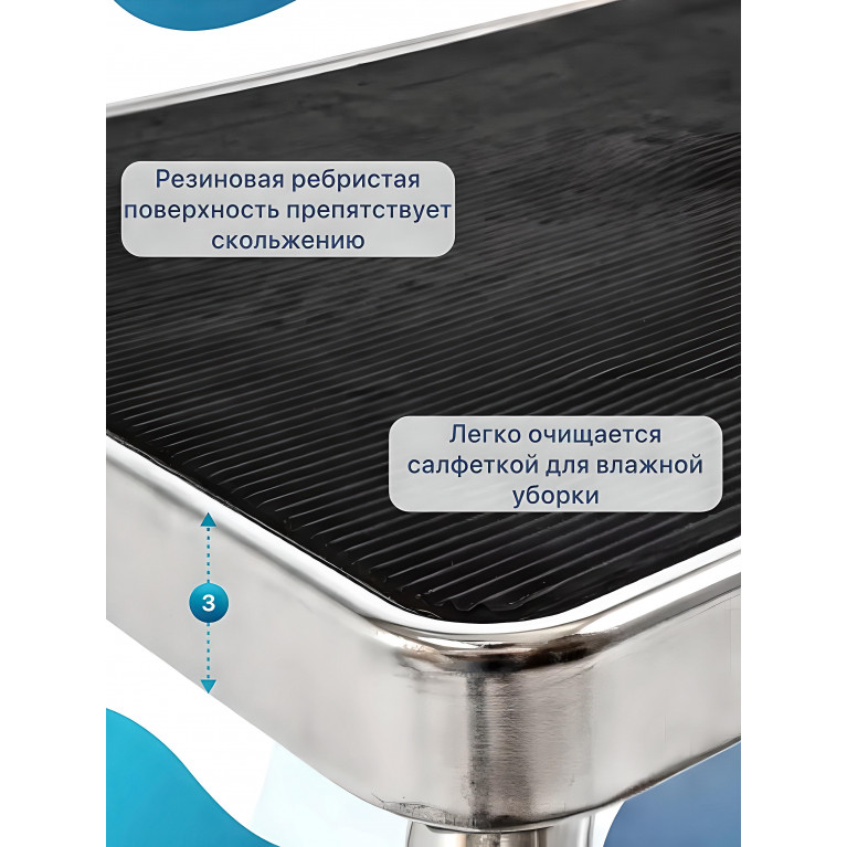 Резиновые насадки на ножках и резиновое покрытие платформы защищают от скольжения и получения травм. Резиновые насадки также не оставляют царапин на поверхностях.