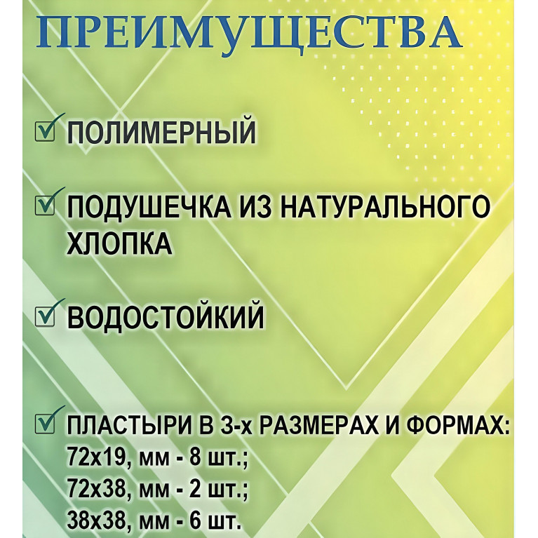 Пластырь из полимерного материала с подушечкой из натурального хлопка, ламинированной полиэтиленовой перфорированной плёнкой, в индивидуальной упаковке состоящей из принтованной бумаги и прозрачной пленки.