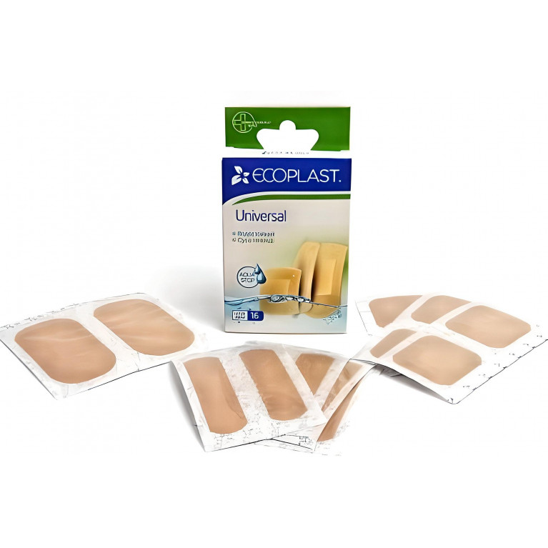 Пластырь медицинский водостойкий для фиксации UNIVERSAL Ecoplast выполнен из полимерного материала с подушечкой из натурального хлопка, ламинированной полиэтиленовой перфорированной плёнкой.